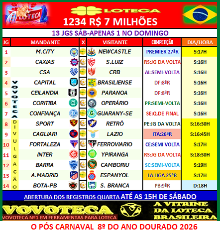 Loteca 1233:Placar-Previsão-Festa das feras /1234:Programação 14/02/2026 // 412 comentários Final de semana de gala na loteca com 5 milhões e meio na mesa, entra na torcida pé quente >continue
