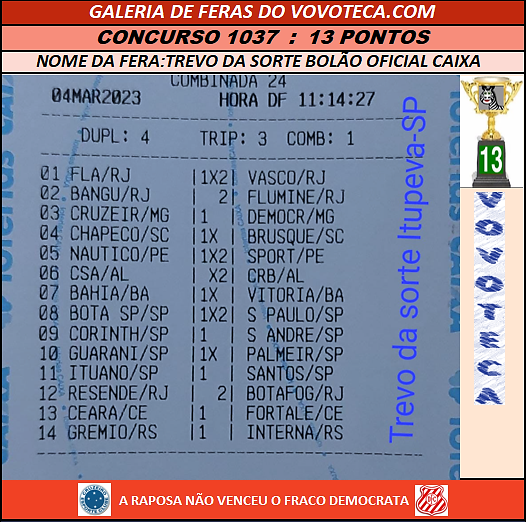 Em um concurso de alta complexidade, o jogo do amigo Trevo da Sorte anunciante no vovoteca mostrou competencia e leva o prêmio de 13 acertos / PARABENS FERA