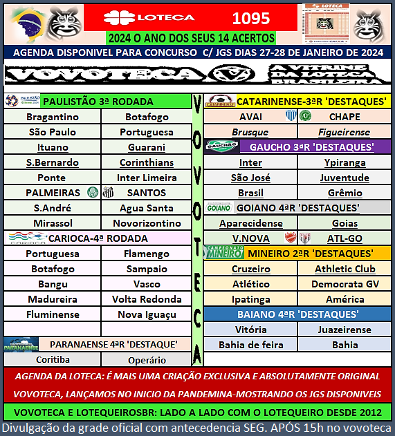 LOTECA 1095: Agenda / Os estaduais avançam nas rodadas, isso dá ao apostador uma melhor visão em suas analises /Segunda a grade oficial antecipada após as 15:30h