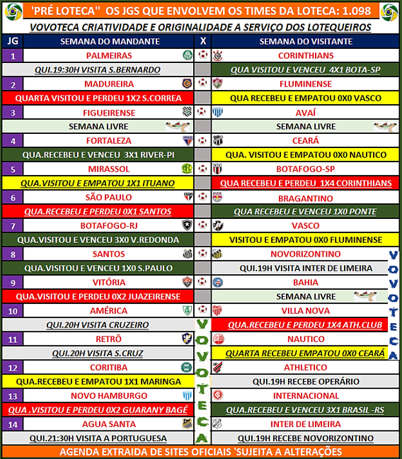 Loteca 1098:Programação-Enquete-Planilhas estatisticas-Pré loteca resultados-vovotecatv