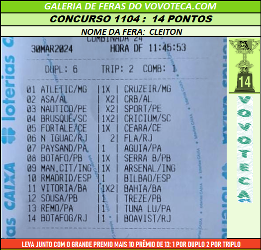 Festa das feras 1104: um jogo bem marcado, duplos bem aplicados e os 14 chegando. Isso é loteca parabéns