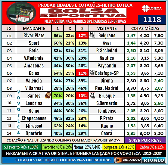 Bolsa esportiva com as probabilidades e cotações das grandes operadoras esportiva ‘filtrados desde 2012 em trabalho criativo por exterminador-vovoteca, para loteca/ Nesse 1118 a cotação final atinge 9.786 por real// ODD final abaixo de 10 mil pontos, sempre indica uma loteca favoravel a ganhadores, porém percebam que em 8 jgs os especialistas divergem nas opiniões deixando esses jgs com o status de no minimo dificeis, mas sempre com um ligeiro favoritismo em alguma coluna // Bons estudos boa sorte sempre