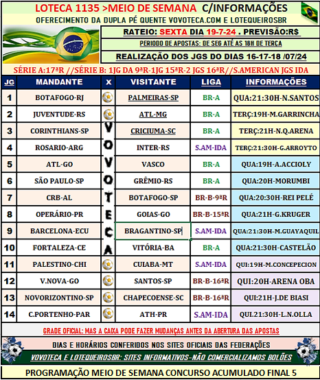 Loteca 1134:Programação-Prognósticos-Loteclima-Matriz 14secos/1135:Programação