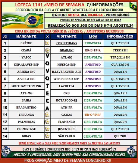 Loteca 1140:Prognósticos-Matriz 14 secos/1141:Programação postada