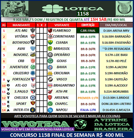 Loteca 1158: grade oficial editada, com dia/hora e locais dos 14 jgs / Registros de quarta até as 15h de sábado