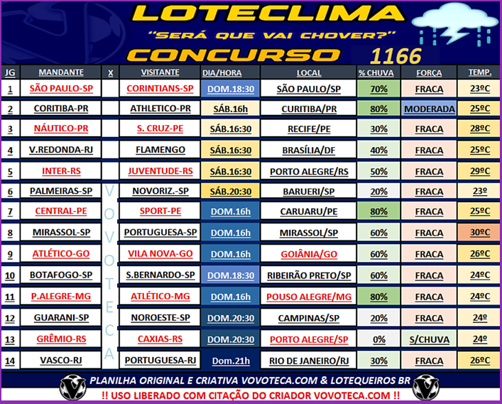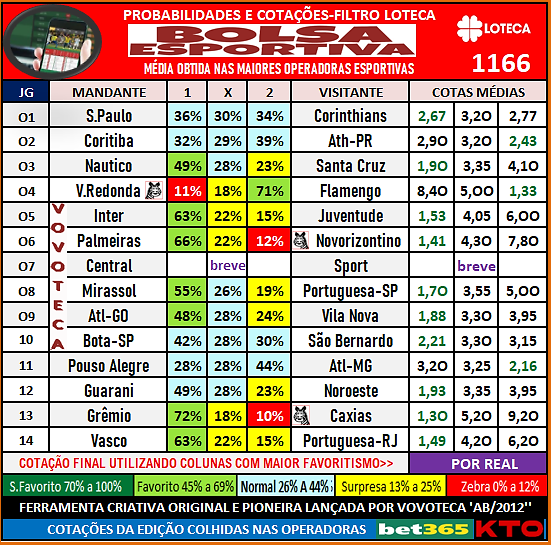 Loteca 1166:Estatísticas -matriz 14secos-bolsa esportiva-parciais enquete-Loteclima