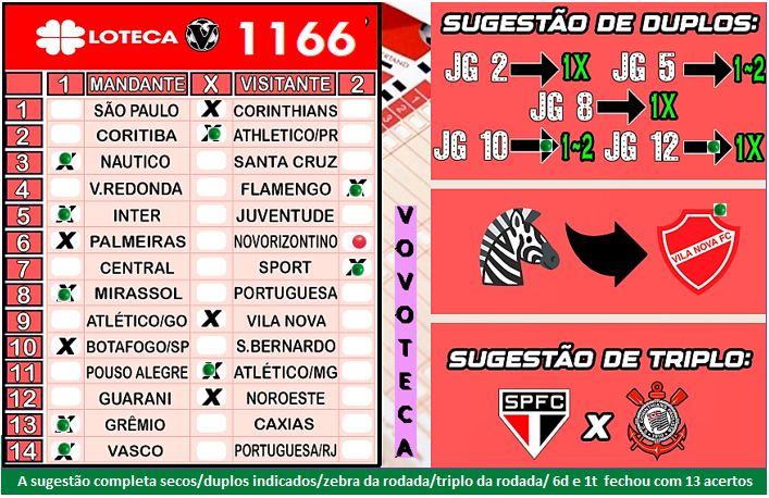 Inicialmente gostaria de parabenizar o sortudo que faturou sozinho (ou bolão) aproximadamente R$ 2.400.000 reais ao acertar os 14P, um excelente prêmio para a realidade da loteca, e ainda os feras que fizeram 13P e gentilmente postaram seus cartões premiados na galeria dos feras do vovoteca e levaram em torno de R$ 1.600 reais um bom prêmio para 13P, e finalmente parabéns ao amigo JP com a sua matriz sugestão e as dicas de (5D/1T/8S), que custa R$ 288,00 e que em se tratando de ter apostado teria feito 13P e faturado aproximadamente R$ 1.600 reais, infelizmente não fiz esse jogo (matriz sugestão com as respectivas dicas do JP), mas a vida segue e agora é focar no 1167 com um prêmio de R$ 250 mil reais e seja o que Deus quiser boa sorte para todos nós e que Deus nos abençoe.