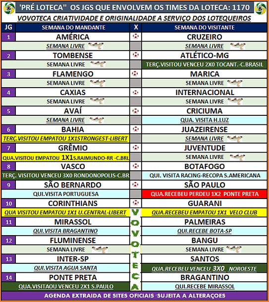 Pré loteca: Loteca é um prato quente que se ‘come pelas beiradas’ assim a semana das 28 equipes precisam ser acompanhadas. planilha-agenda de extrema necessidade criatividade vovoteca / Nesse 1170 , 16 equipes com compromissos que podem mostrar qualidades e defeitos dos times desse concurso/ Confiram ao final dos jgs todos resultados
