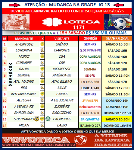 Jogos atrativos disponíveis teremos muitos para a grade do 1172. Que os programadores estejam bem humorados e inspirados para elaborar uma boa programação para Loteca continuar no caminho da ascensão e não voltar a entrar em queda novamente, que foi muito triste esse tempo de decaída, levando a Loteca quase ao fundo do poço pelas frequentes péssimas programações no período.