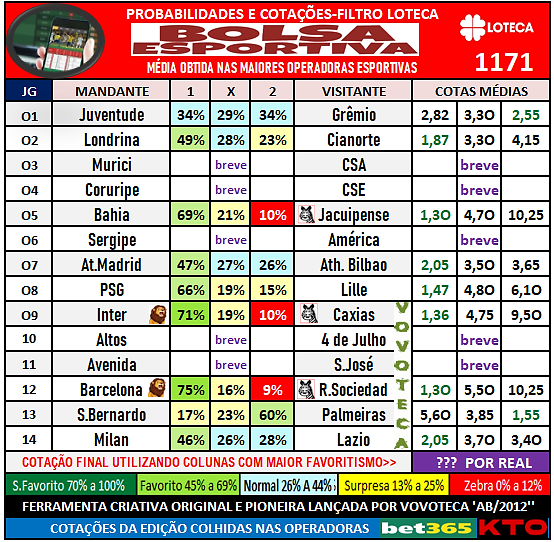 Loteca 1171: Sem duvida a loteca volta a crescer no coração da nação lotequeira , a otima mudança de percentual na faixa de premiação dos 37,61% para 55% fez um efeito imediato, aqui nosso post principal com o tradicional show de planilhas estatisticas, e no nosso blog auxiliar os tradicionais posts individuais jogo a jogo> JG A JG>SÓ CLICAR<