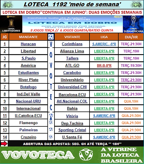Loteca 1192: Proximo meio de semana com Libertadores/Sulamericana/BR-B