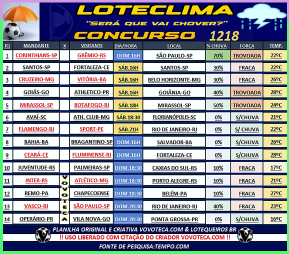 Loteclima: As probabilidades de chuvas com as previsões de temperatura na hora dos 14 jgs/ Possibilidade maior de chuva forte com algum impacto nos jogos Corinth x Grê /Goias x Ath/ Mirassol x Bota, e ainda campo molhado para Vasco x SP ‘levem as travas altas ou escorregões a vista’