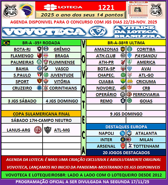 AGENDA 1221: O concurso com a volta do Brasileirão ,na mesa do programador os jogos disponiveis para os dias 22/23  de novembro/25/ Nessa segunda a grade oficial