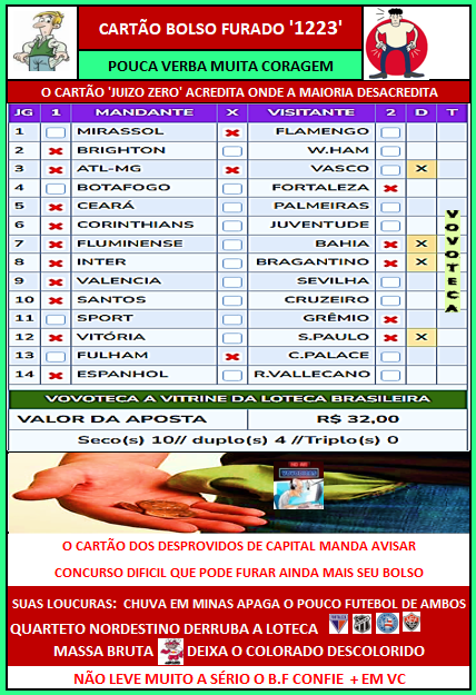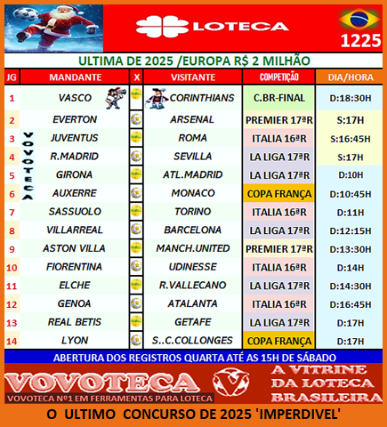 Na penultima de 2025, o prêmio foi turbinado devido ao acumulo do 1222, e turbinada também deve ser nossa pré loteca, aqui nosso post principal e ainda fica o convite visitem os posts jogo a jogo em nosso blog auxiliar>>>JG A JG>SÓ CLICAR<