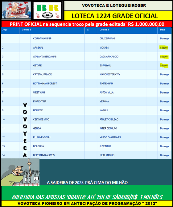 1224: Agenda disponivel do concurso que finaliza o ano da loteca em 2025, jgs disponiveis nos dias 13/14 Dezembro-25 // Nessa segunda a programação oficial