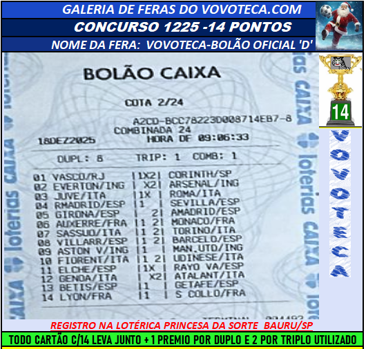 Festa das feras: Em um concurso sem zebras e apenas duas leves surpresas é esperado um numero grande de apostas com 14 acertos as previsões postadas abaixo + de 120. Mesmo assim se tem 14 é hora de comemorar, parabéns a todos que chegaram lá, entre as feras o bolão vovoteca que está ha pouco tempo na disputa chega novamente aos 14 acertos (bolão D o caça zebras) tendo ainda fechado com 13 nos bolões B-C, ISSO MOSTRA QUE TEREMOS UM 2026 PROMISSOR, destaco principalmente os pequenos jgs individuais q levarão uma cesta de natal mais recheada, segue abaixo os cartões que recebemos