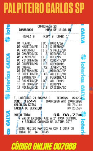 Achei muito interessante esse jogo da lotérica Princesa da Sorte pelo fato de buscar duas zebras nos jogos do Flamengo e Palmeiras. Difícil de acontecer? Sim, o porém, são nesses jogos que geralmente está a chave do pote dourado. Só não concordei com o duplo aberto no jogo do Cruzeiro x Grêmio. Poderia utilizar esse duplo em jogos mais complicados, tipo Santos x Fluminense. Porém, para total desespero da galera lotequeira que estavam vivos para14 (inclusive eu) o Mirassol praticamente acabou decretando a acumulação. Mais um tropeço nos jogos da tarde/noite e vamos para a casa dos 6 k na semana. Vivo para 13 ainda num joguinho de 4 duplos ($ 32,00).